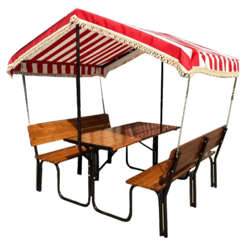 Taxtalar ikiqat şəkildə laklanır. Ümumi hündürlük isə 210 sm-dir. Tendə vurulan parça İspaniya istehsalıdır, su keçirməz, gün şüası altında qaldıqca rəngi solmaz, kirləndikdə asan təmizlənəndir. Karkas dəmirdən, ümumi besedkanın materialı – taxta.